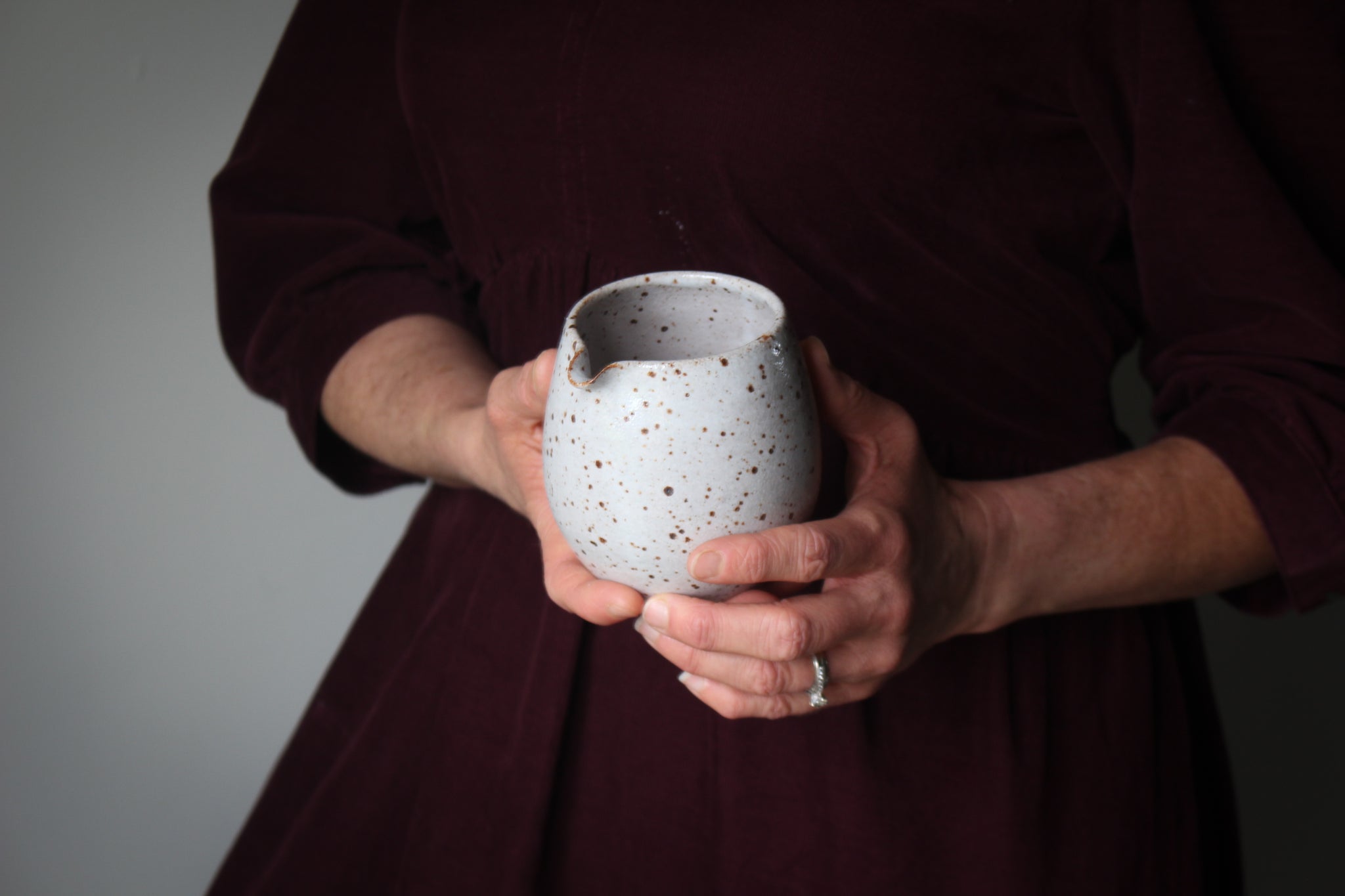 – Sold OutNo-frills kinda gal. Smooth and simple, speckled/white handleless jug. I fashioned this shape on the pottery wheel, and added the little pouring spout by passing one finger over the lip...