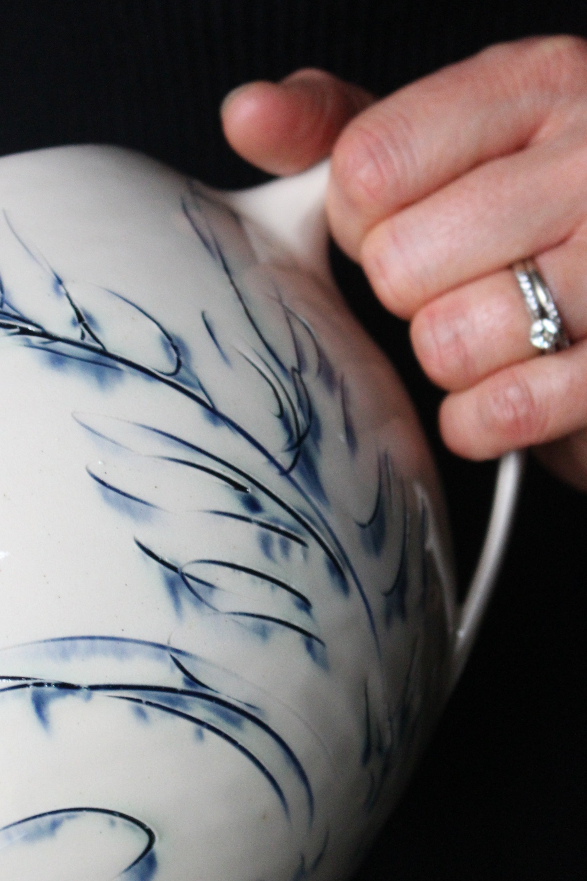 I threw this sleek pitcher on the pottery wheel and covered it in layers of slip and glaze making it safe for use with food and drink. I’ve added the...