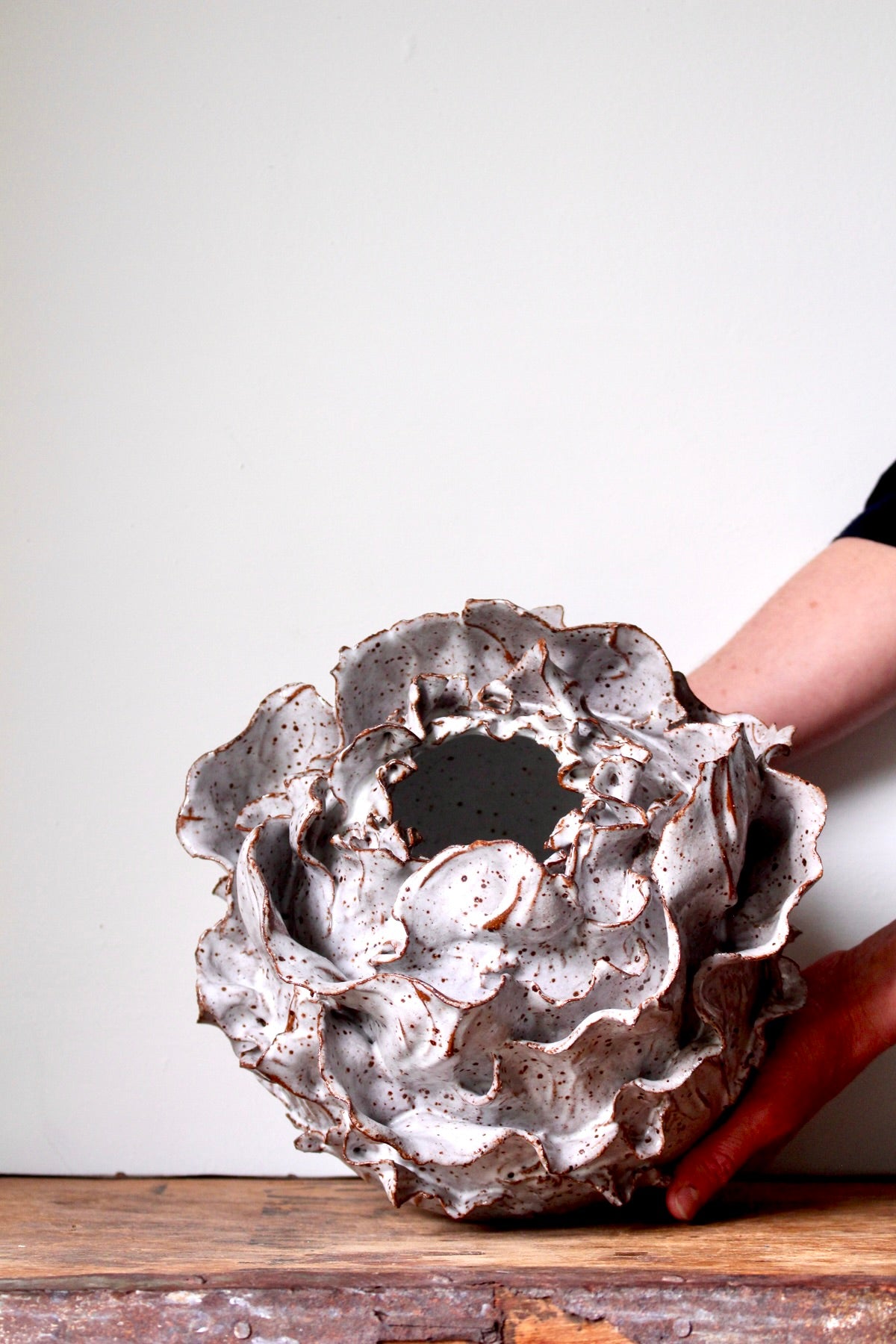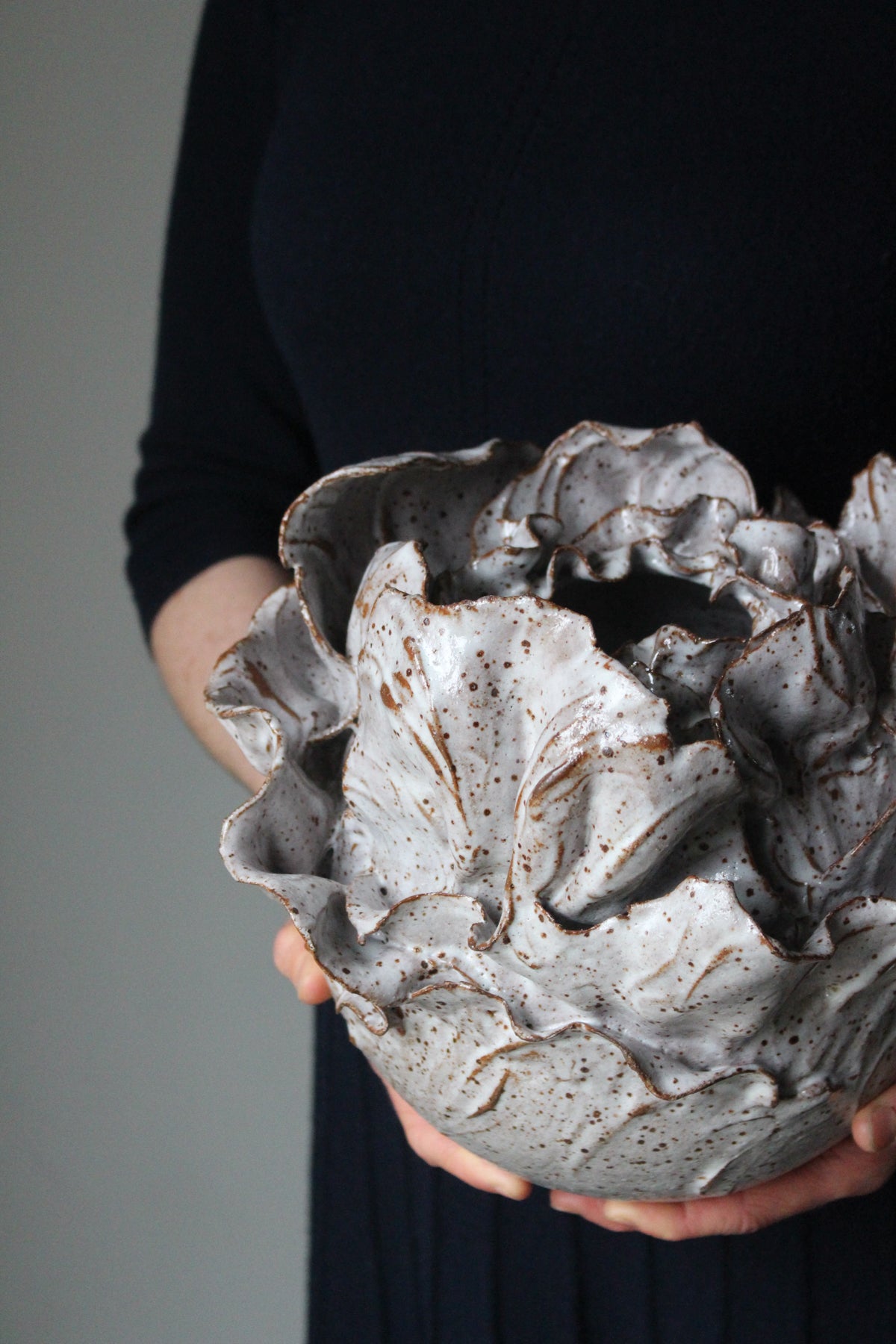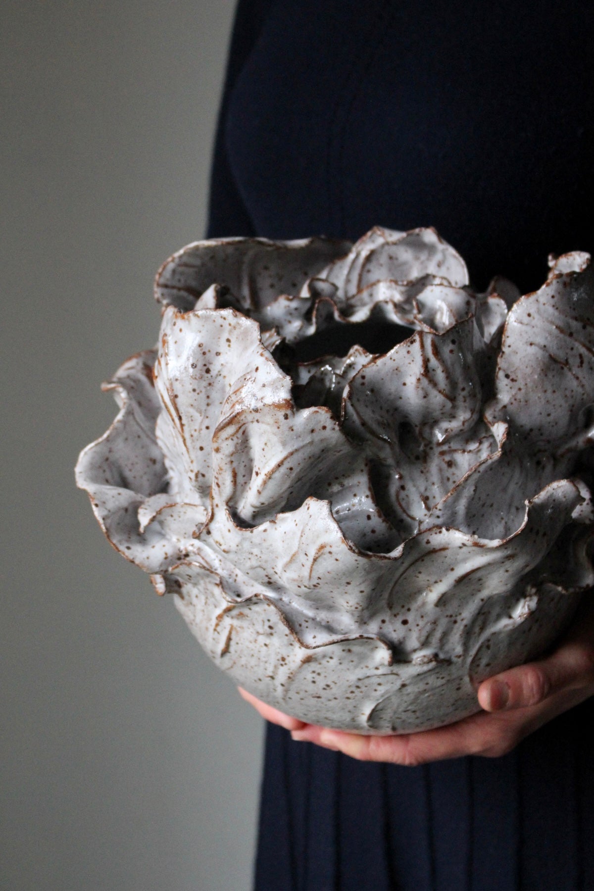 A beautiful, wheel-thrown, serving bowl or centrepiece in a cream/white, speckled finish. The graceful edge was carefully carved away by hand…piece by piece. Please see image with ruler for general...