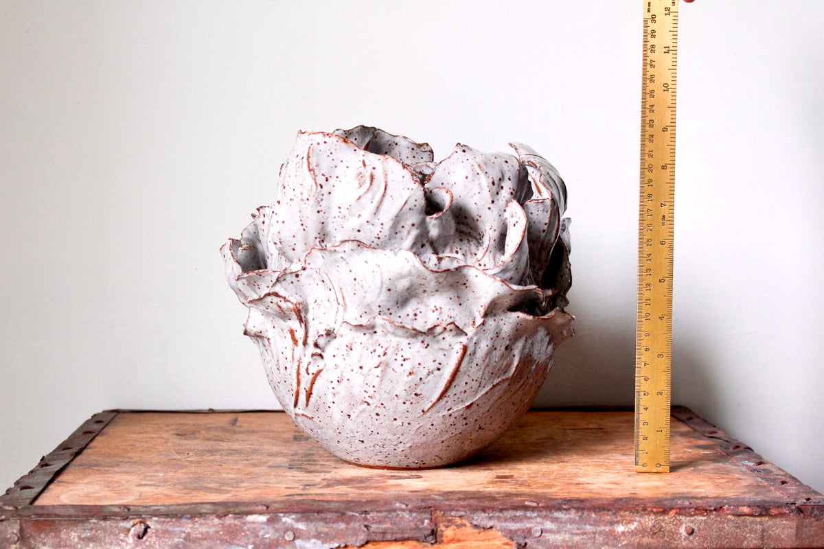 A wheel-thrown vase made of speckled, stoneware clay. This vessel has been glazed with a creamy white, speckled, water-tight finish and is perfect for arrangements. Please see image with ruler...